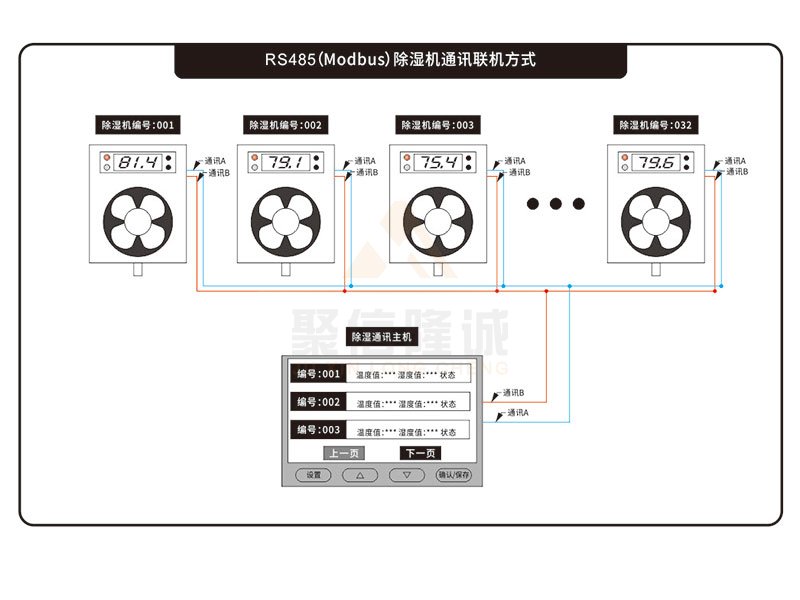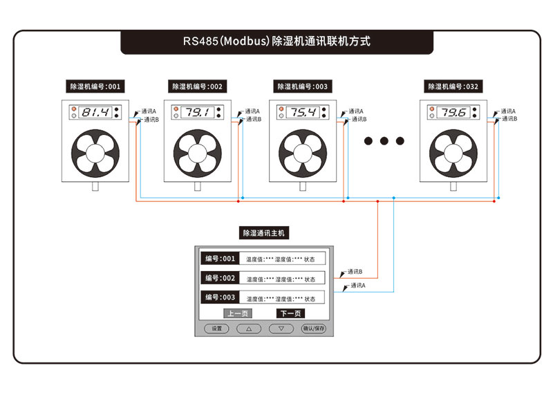 智能型除濕裝置主機采用RS485的接口與除濕裝置通訊,可以實現在主機顯示板面上查看主機運行數據并控制修改參數等功能;該產品可以與本公司所有帶“S”通訊功能的除濕裝置通訊